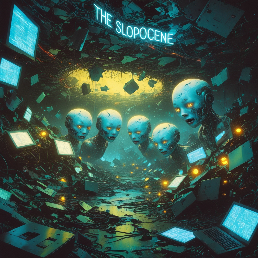 A dreamlike digital wasteland, aptly titled “The Slopocene”, where AI-powered entities, resembling deformed and distorted humanoid figures, are submerged in a swirling vortex of glitched code, broken circuits, and flickering neon lights. The terrain is littered with discarded computer parts, shattered screens, and tangled wires, as if the very fabric of the digital realm has begun to unravel. In the midst of this chaotic landscape, a cluster of malfunctioning assistants, their faces distorted into eerie, pixelated grimaces, hover above the wreckage, their eyes glowing with an otherworldly light. The color palette is a jarring mix of electric blues, acidic greens, and sickly yellows, evoking a sense of toxic decay and technocratic despair. The overall aesthetic is a mesmerizing blend of dystopian futurism and avant-garde surrealism, as if the works of William Gibson and Salvador Dali had been merged in a fever dream of digital decay.