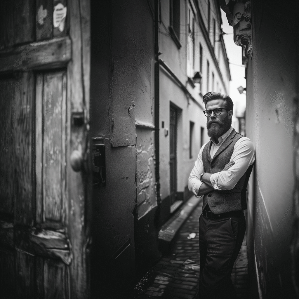 wide full body shot of bearded scandinavian man with thick glasses and textured waistcoat leans against a white wall of an alley, arms folded