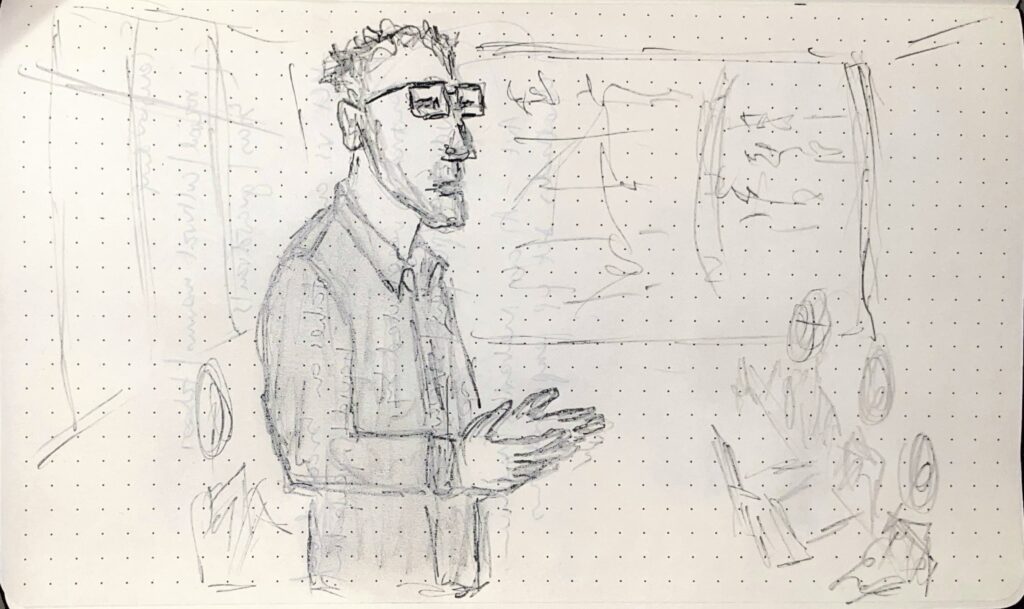 A sketch of a male academic presenting to a group of people. by me!